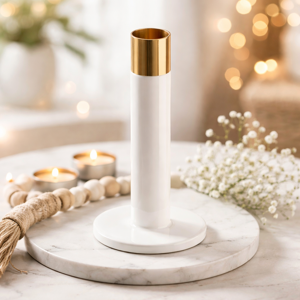 Zeitlose Eleganz trifft auf modernes Design: Der Kerzenhalter „X-Style“ überzeugt durch seine klare Formensprache und den edlen Goldrand, der einen luxuriösen Akzent setzt. Das harmonische Zusammenspiel aus strahlendem Weiß und warmem Gold verleiht diesem Kerzenständer eine besonders stilvolle Ausstrahlung.