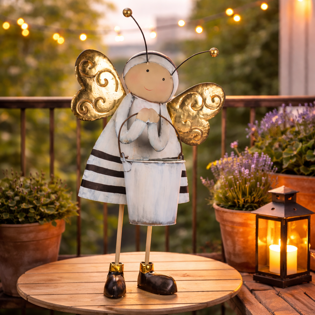 Elegante Deko-Ikone in zeitloser Schwarz-Weiß-Gold-Kombination. Die liebevoll gestaltete Biene bringt charmante Wärme in jeden Raum, ob Wohn-, Schlaf- oder Bürobereich. Die stilvolle Übertopf-Figur steht sicher aufrecht, der Eimer ergänzt das Design mit einem verspielten Akzent. Ideal als Eyecatcher auf Fensterbank, Sideboard oder Regal – dezent, hochwertig und vielseitig kombinierbar. Größe 53 cm sorgt für sichtbare Wirkung, ohne den Raum zu überladen. Ein harmonischer Hingucker für naturnahe oder moderne Einrichtungsstile.
