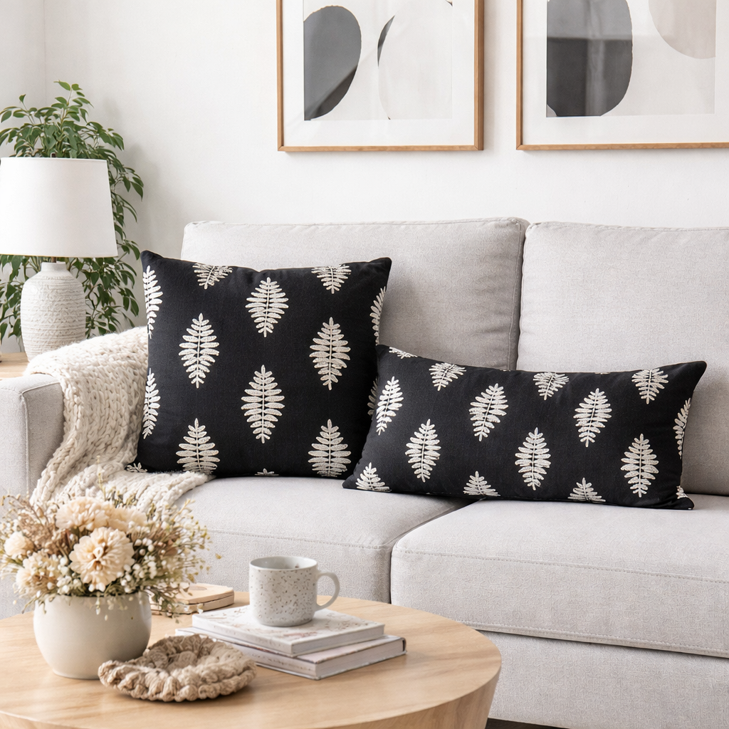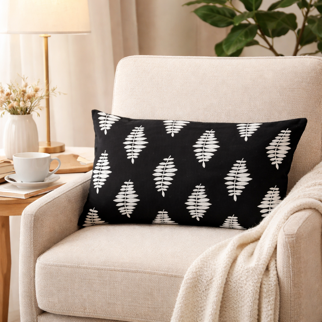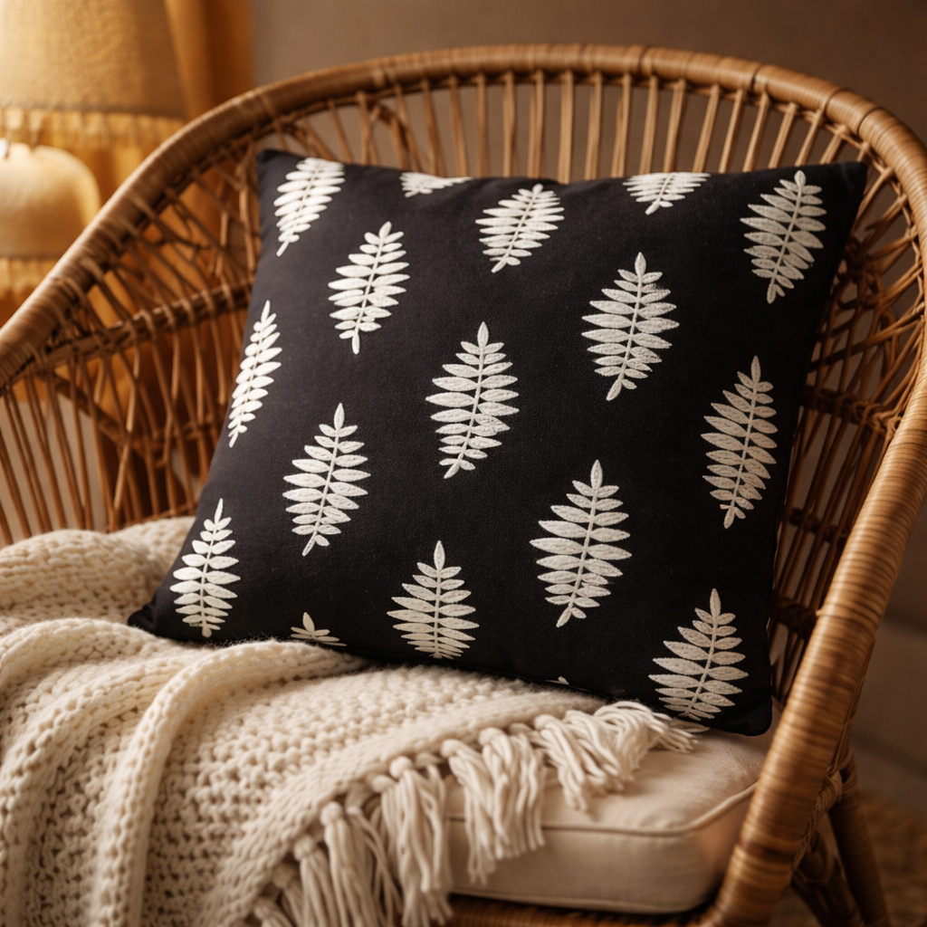 Dieses elegante Zierkissen in Schwarz-Weiß bringt sofort Ruhe, Stil und Charakter in dein Zuhause. Das grafische Muster wirkt modern und zeitlos zugleich und lässt sich wunderbar mit skandinavischen, minimalistischen oder boho-inspirierten Wohnstilen kombinieren.