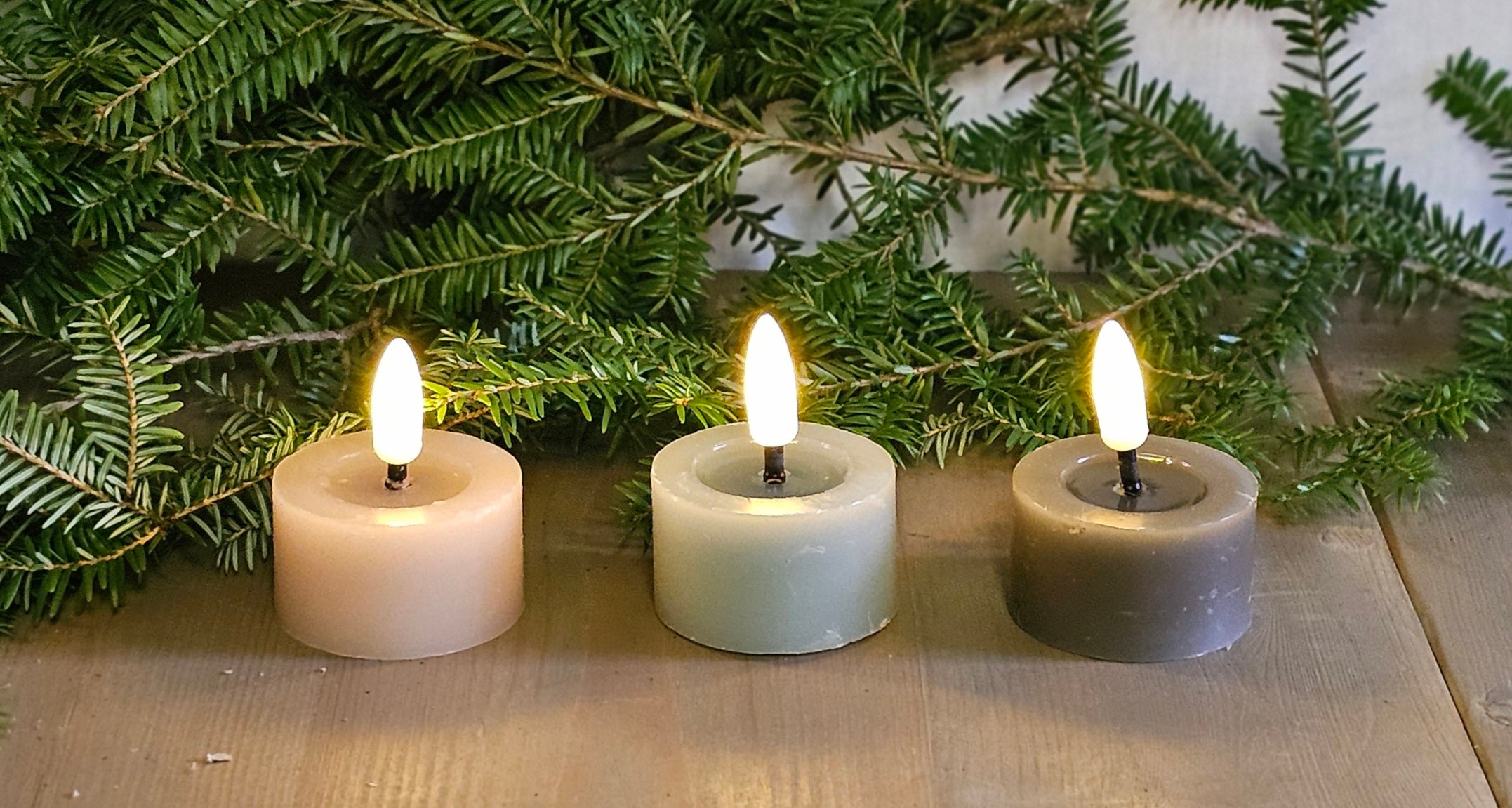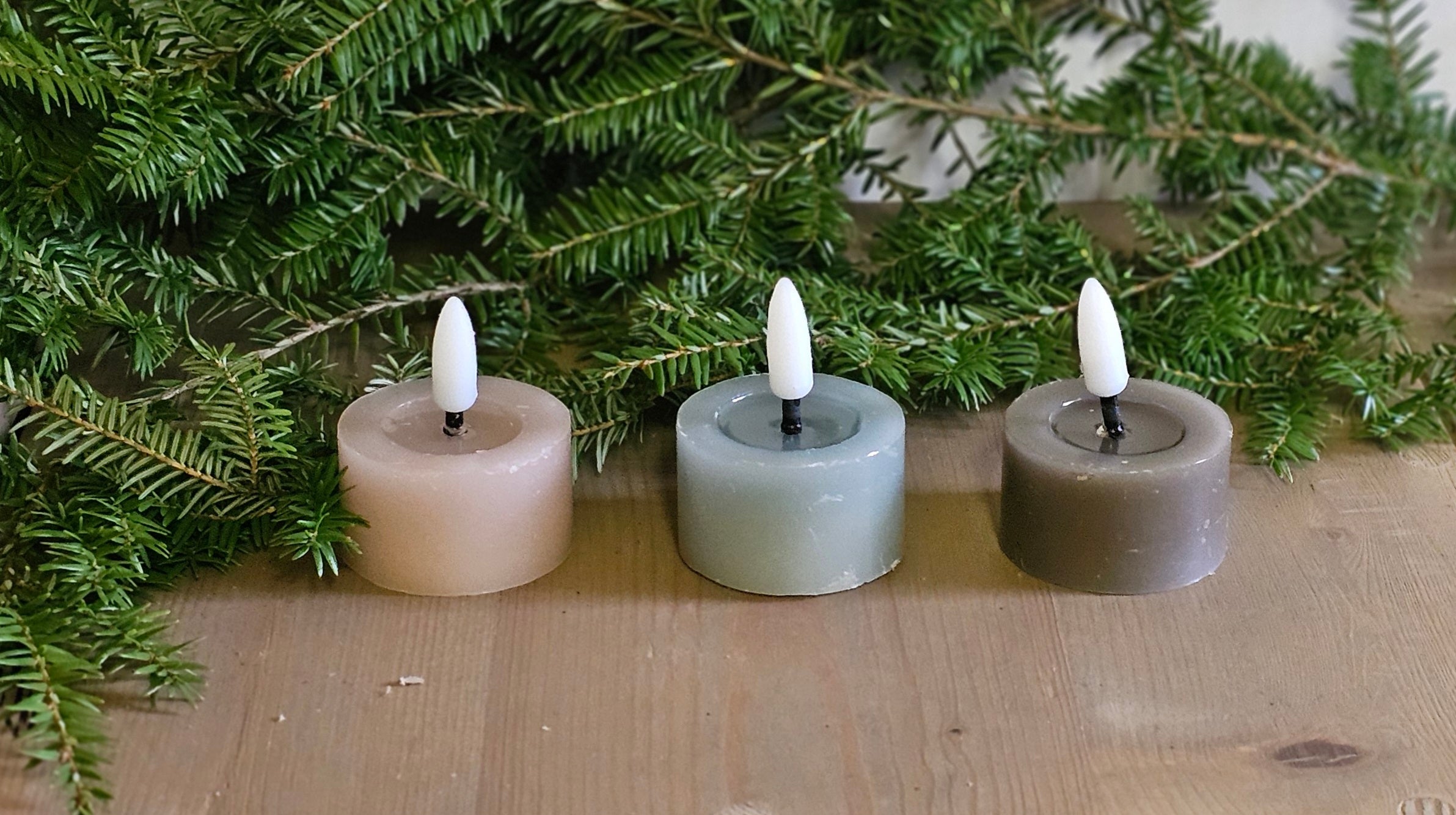 LED Teelicht Set (3 Stück) "3D" / Dekokerzen Wachs mit Timer – pink-grau-sand – Höhe 2,5 cm – Ø 5 cm