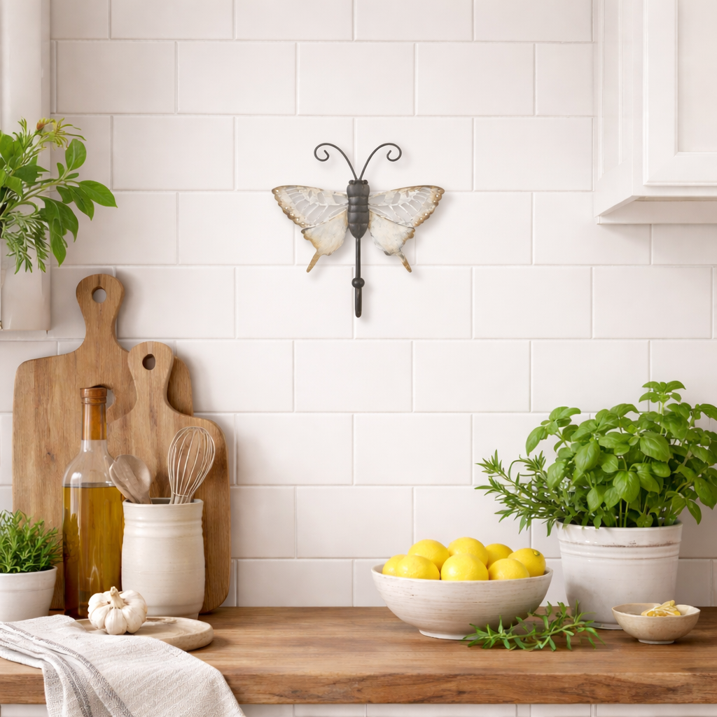 Der filigrane Schmetterling verleiht dem Haken eine leichte, verspielte Optik, während der stabile Kleiderhaken zuverlässig Platz für Jacken, Taschen, Tücher oder Küchenutensilien bietet. Besonders schön wirkt er einzeln oder in Kombination mit mehreren Haken.